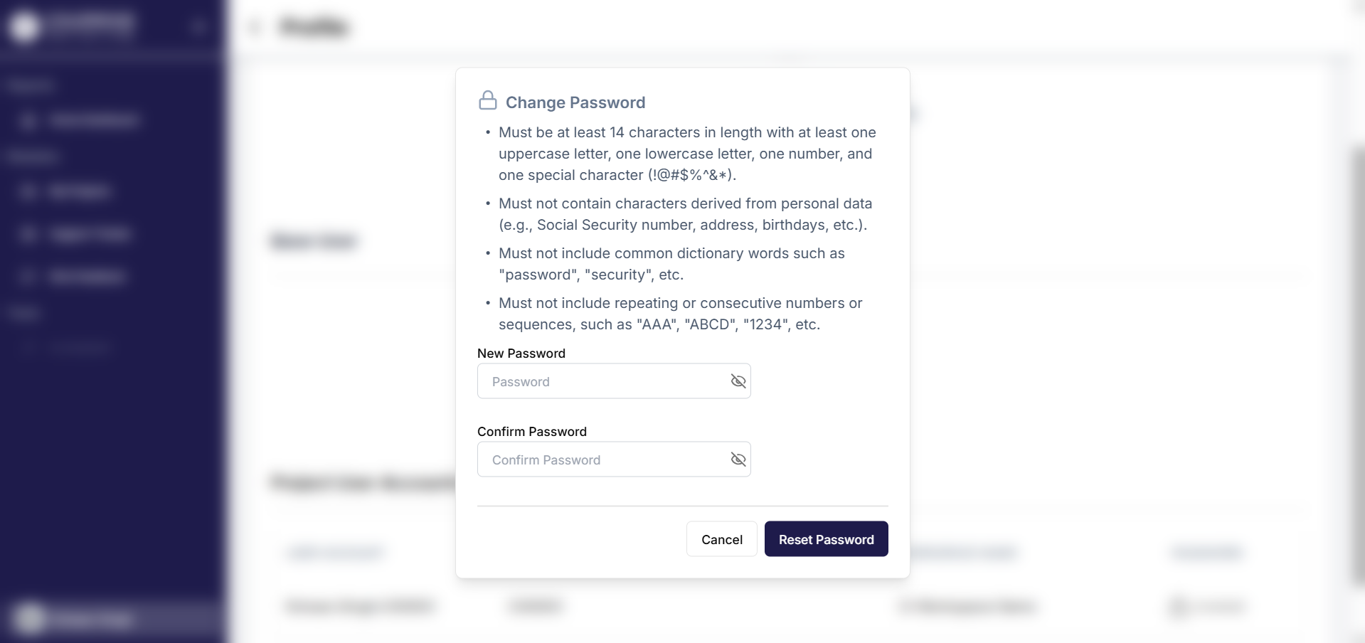 - You will see a popup that asks you to enter a new password that need to match a guideline to ensure security. Refer to the image below for the guideline.