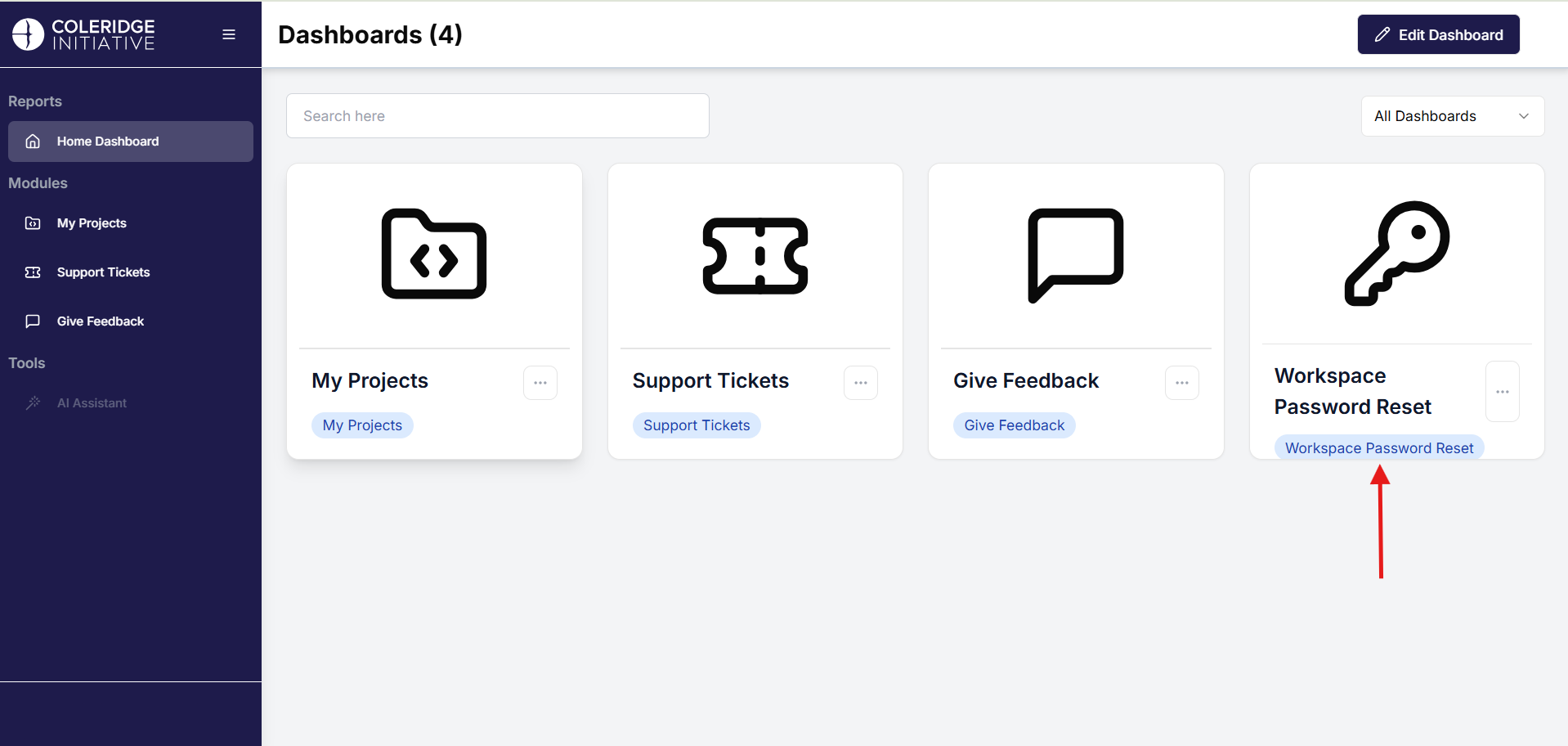 - Click on the tile on the rightmost side of the Pass Portal app called “Workspace Password Reset” as shown below.